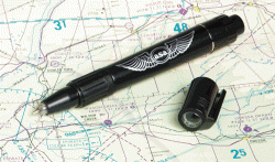 See what you write - even at night! Saves pilots from using an overhead light when writing in a low-light situation, and the green LED light will maintain a pilot's night vision. LED lasts a lifetime! The flashlight cap enables pilots to look for items nearby, serving as a temporary illuminant. The positive on/off flashlight switch helps preserve battery life. The smooth, ball-point pen features a rubber grip for comfortable writing. The clip on the cap allows for easy storage. An excellent addition to all flight bags!