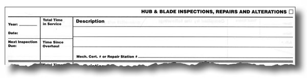 Record data for hub and blade inspections, repairs and alterations, airworthiness directives, and factory bulletins.