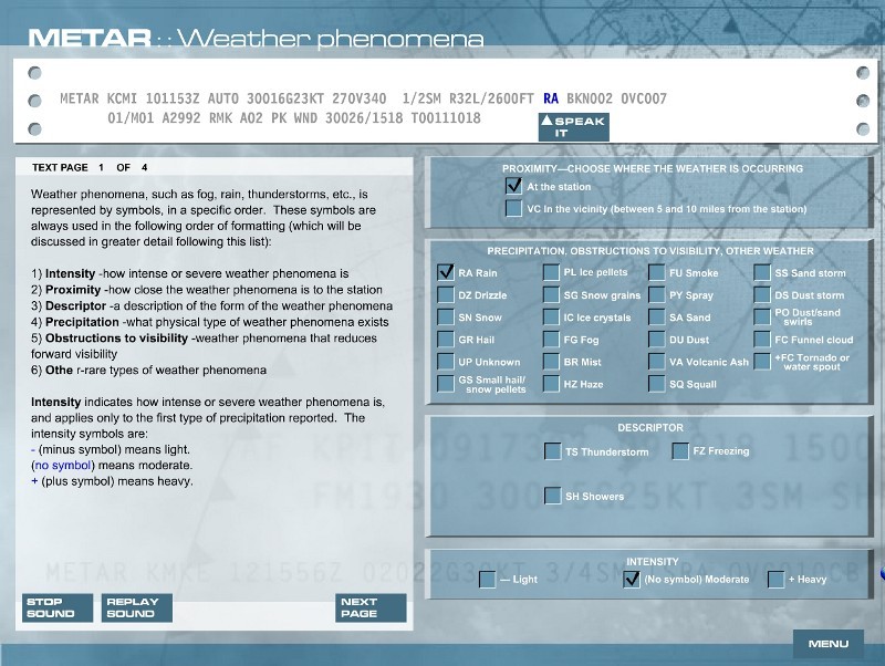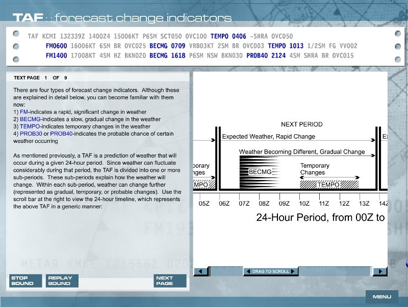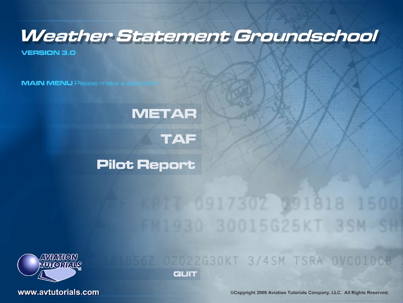 a CD-ROM-based course on METAR's, TAF's, and Pilot Reports. Nearly 3 hours of stunning, interactive training is provided.
